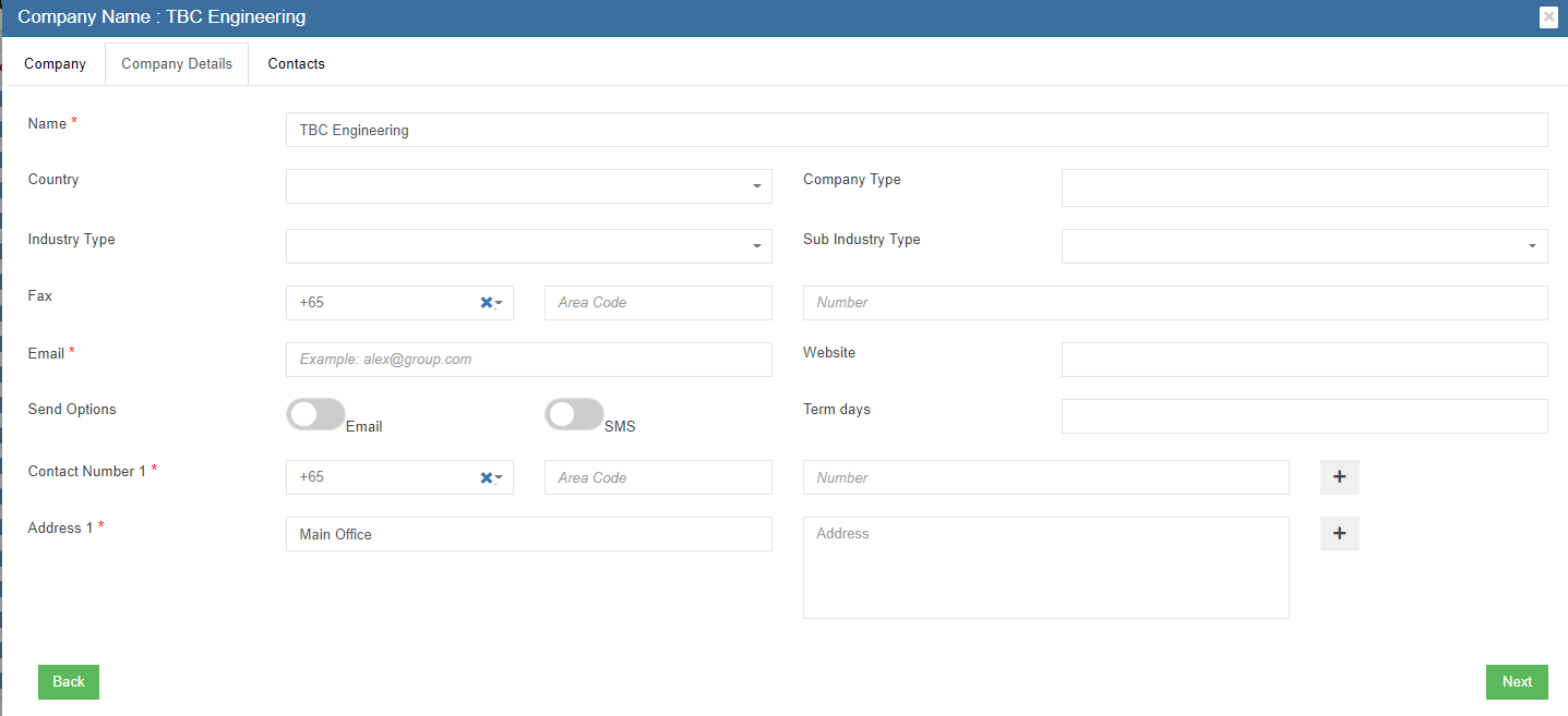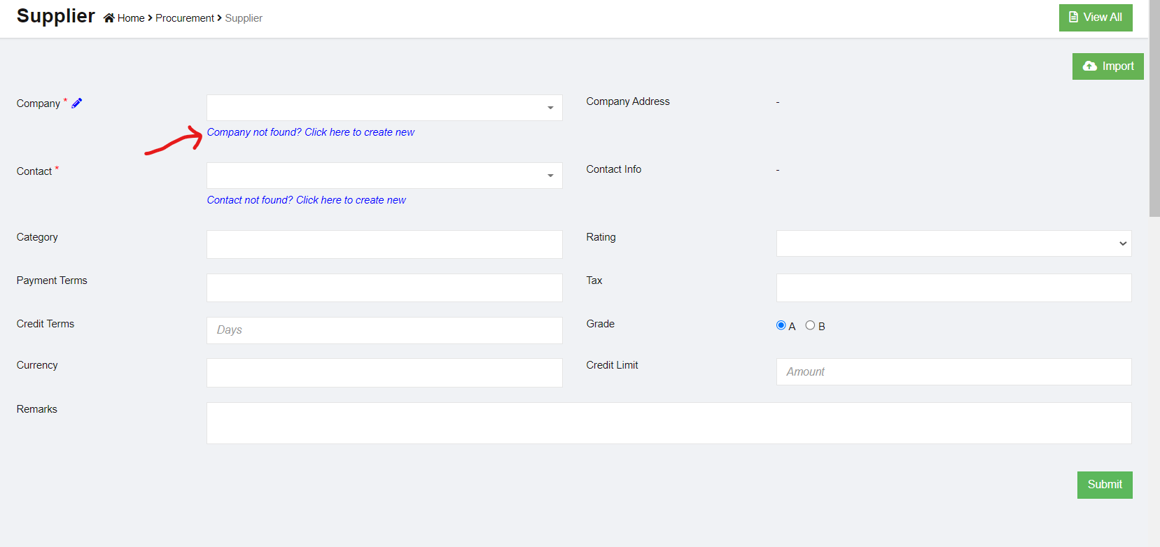 - Select a company from the dropdown list as supplier. If the company is not available, click the link-"Company not found? Click here to create new" below the company dropdown and create a new company. The selected company details are shown in the right side.