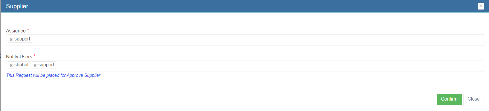 - All new suppliers created in system need to be approved unless auto approval is configured. To approve, click the Approve button in above supplier detail page, below dialog opens,