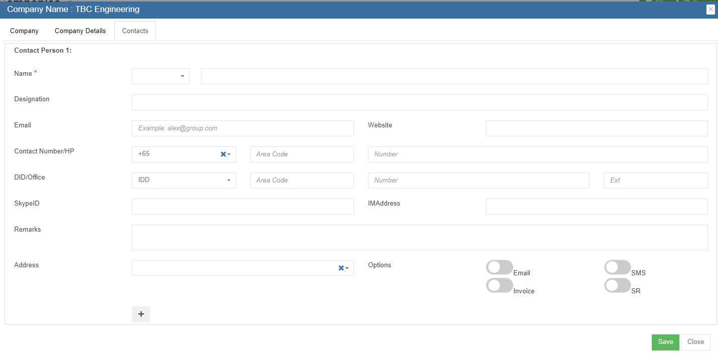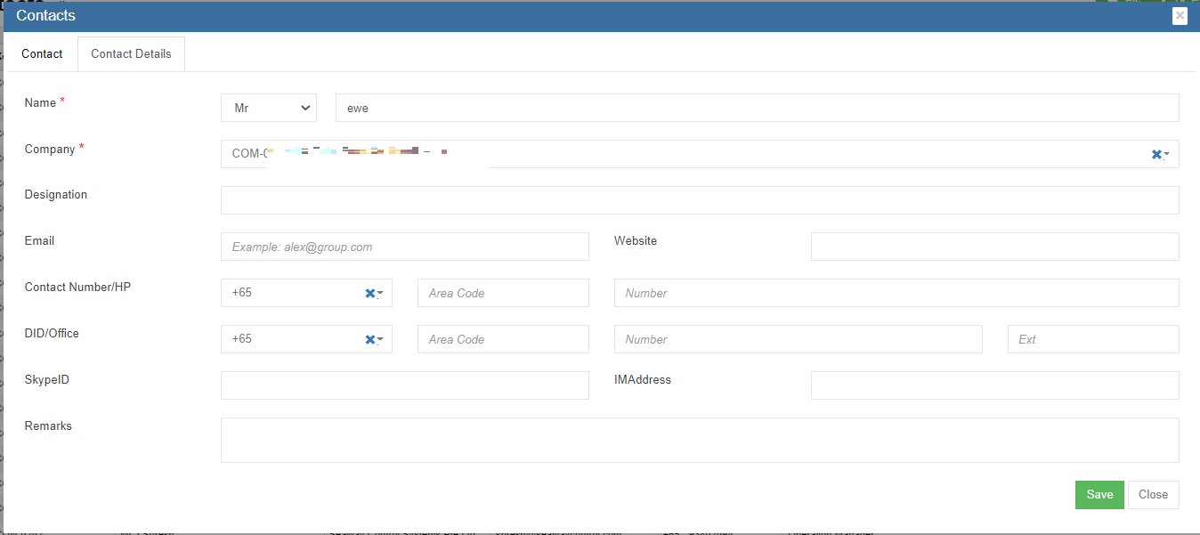 - Click Save to create the contact under the company. The contact data will be saved in contact master as well.