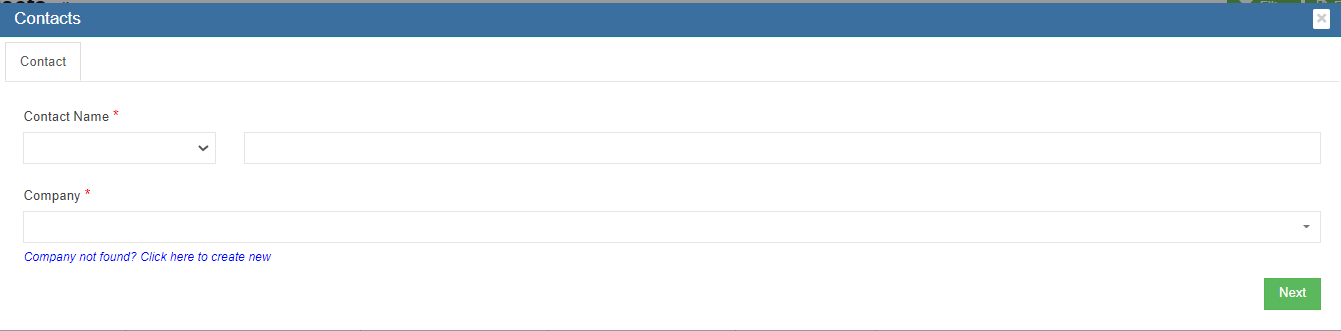 - Select contact from contact master dropdown. The contact details will show. If the contact is not in the dropdown list, click the link "Contact not found? Click here to create new" to create new contact in master data.