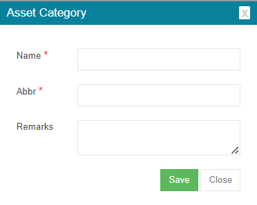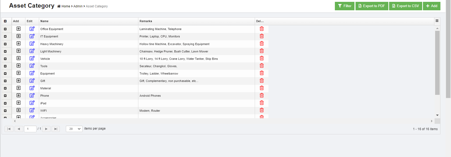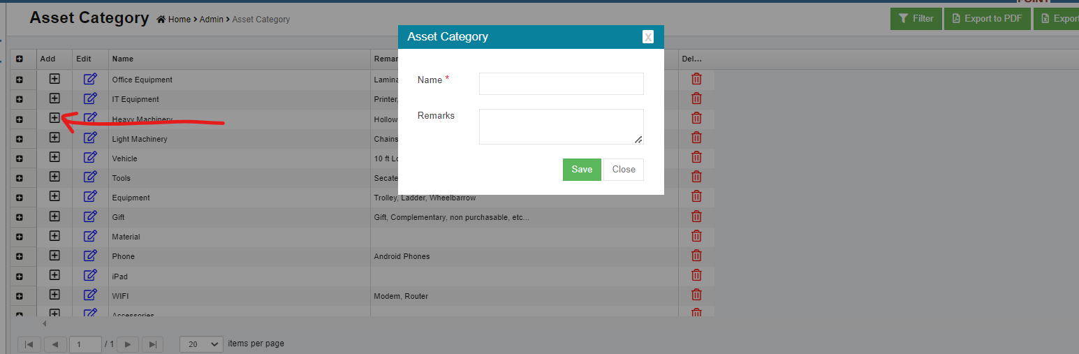 To add sub category of an asset category, click the add icon in the Add column against each asset category.
