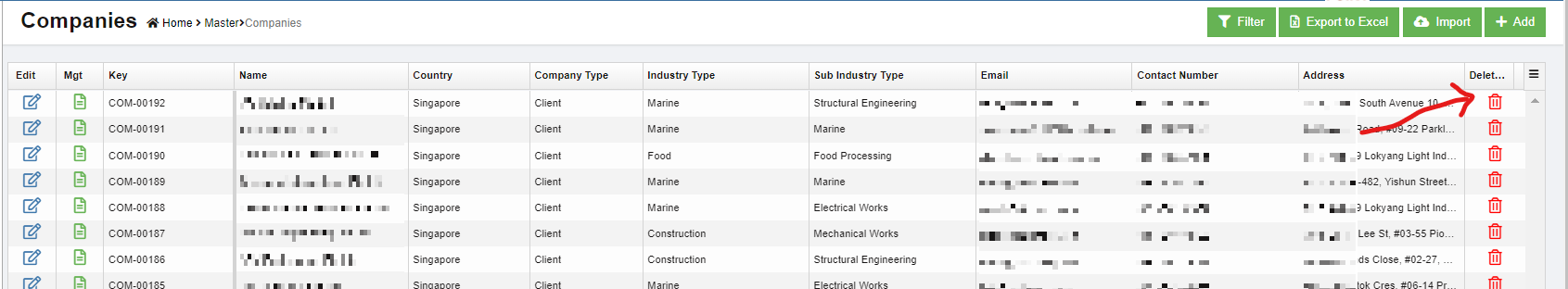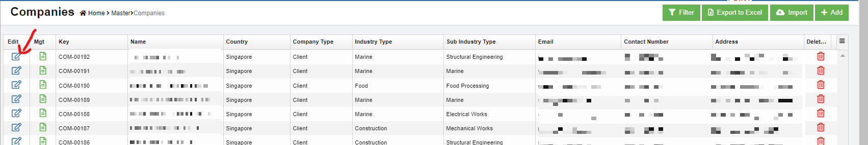 Company master data manages all clients company, supplier company or any third party companies. To view company master list, click Company in the Master menu.
