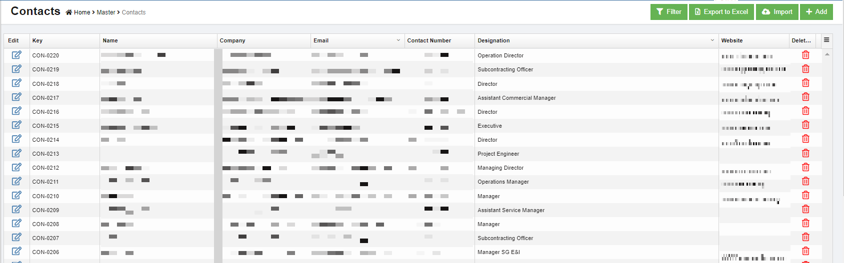 Contacts master contains all contacts data from company master. Contacts master can be added in company master contact tab as well as contact master. To view contact master list, click Contacts in the Master menu,