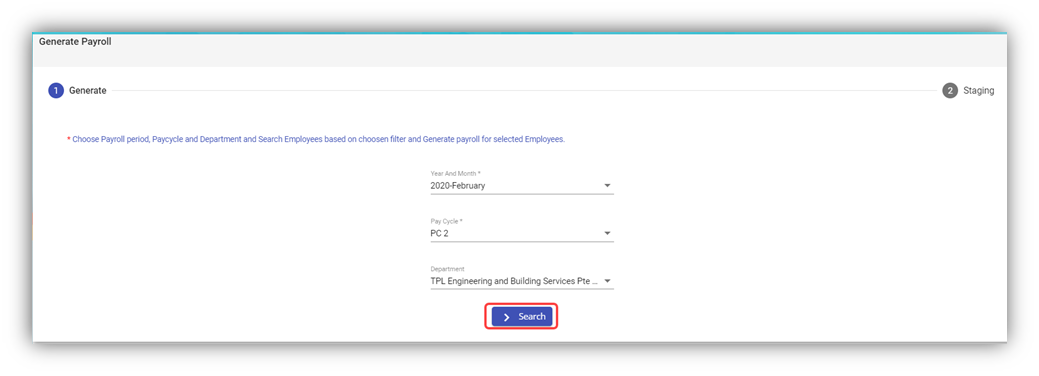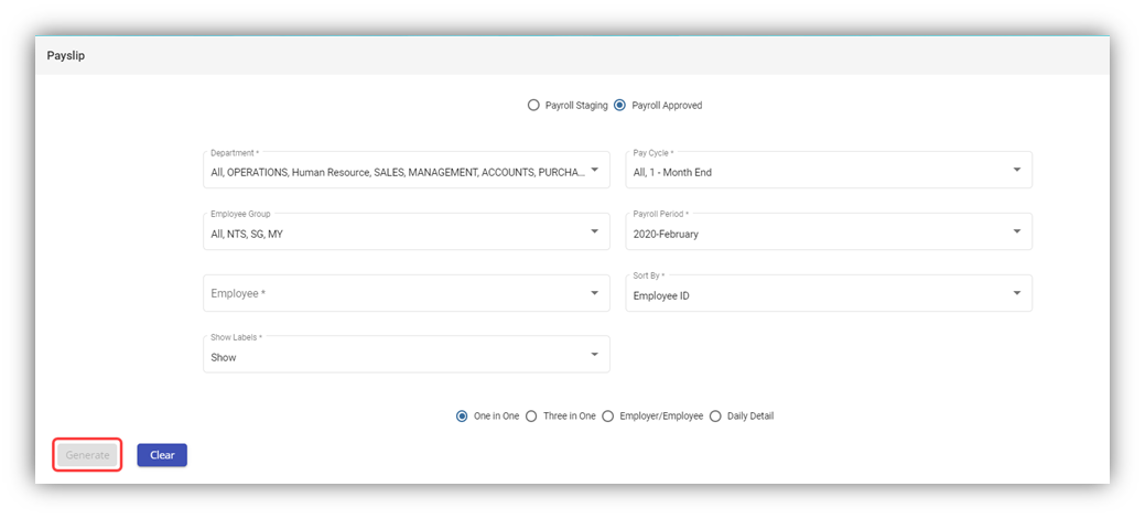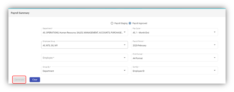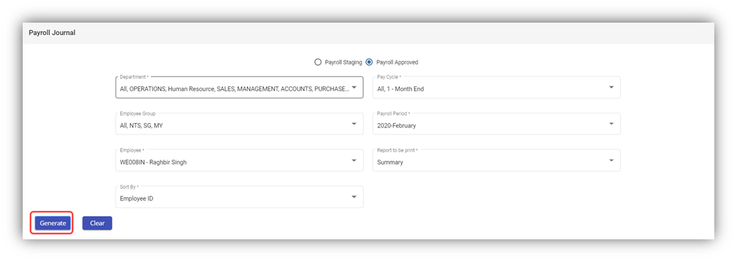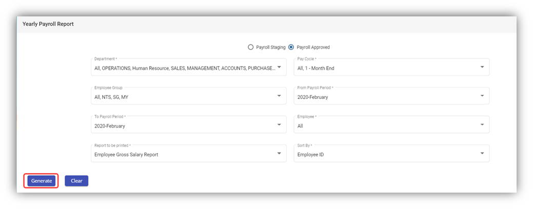 Note: You can generate the yearly payroll report for any employee in both the Payroll in Staging and Payroll Approved stages.