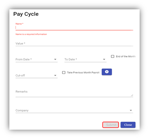 For example, the employer wants to calculate the monthly salary based on the cut-off date format that is from 1st to 24th with the approved Time Sheet and for the remaining days with Full Pay. If any leave has taken in the days which are paid fully, the deduction will be done in the next month pay. To add the pay cycle for the cut-off date format,