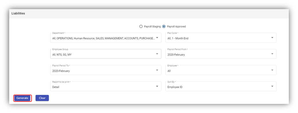 Note: You can generate the liabilities report for any employee in both the Payroll in Staging and Payroll Approved stages.