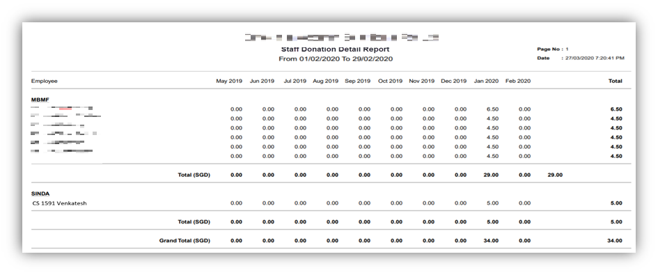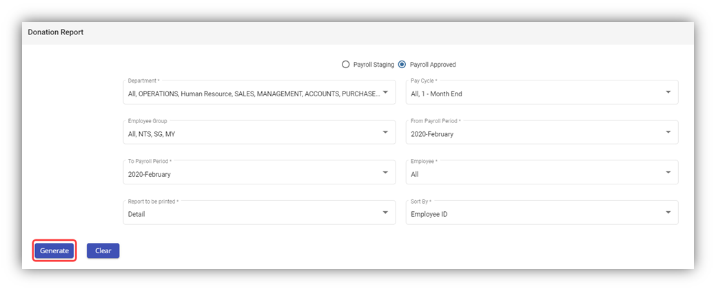 Note: You can generate the donation report for any employee in both the Payroll in Staging and Payroll Approved stages.
