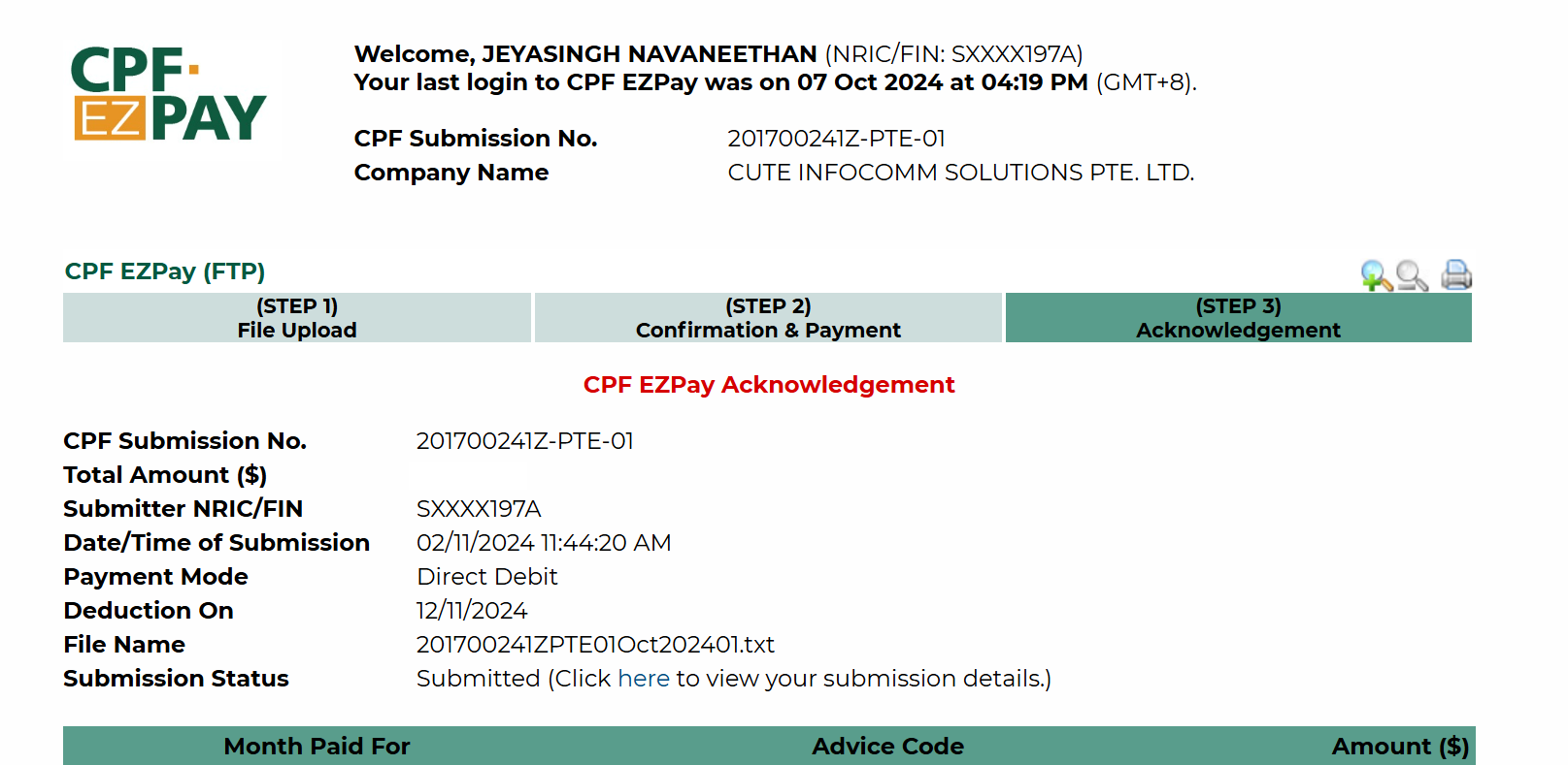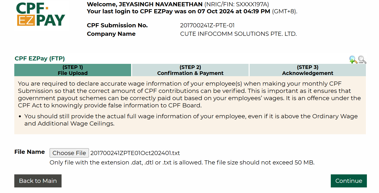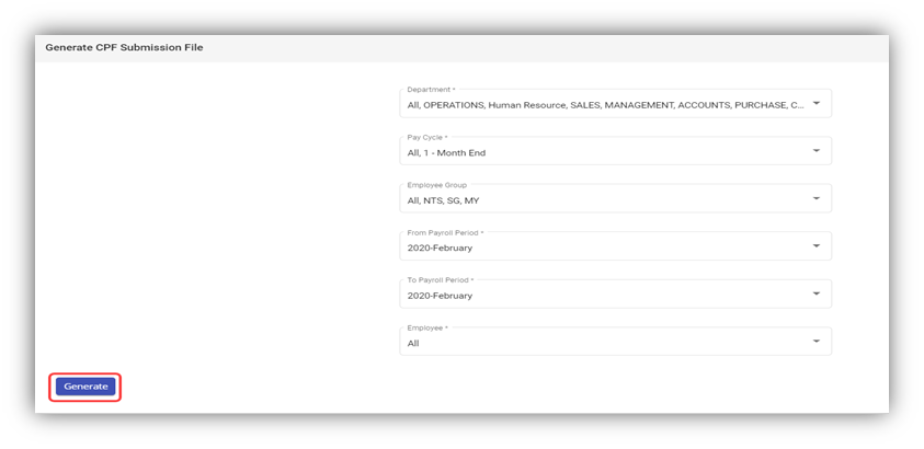 - Click Generate. The CPF submission file will be generated and downloaded as a .txt file. User can use it to upload to CPF portal.