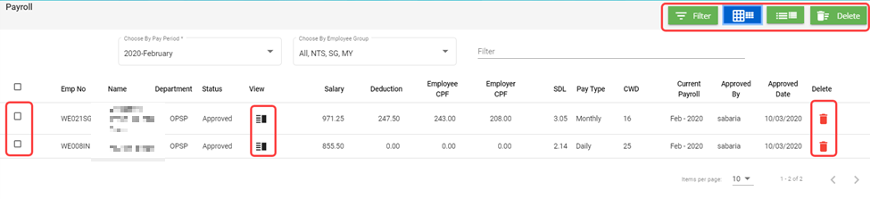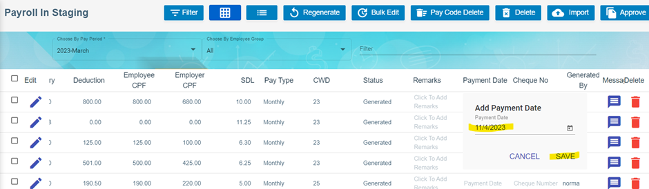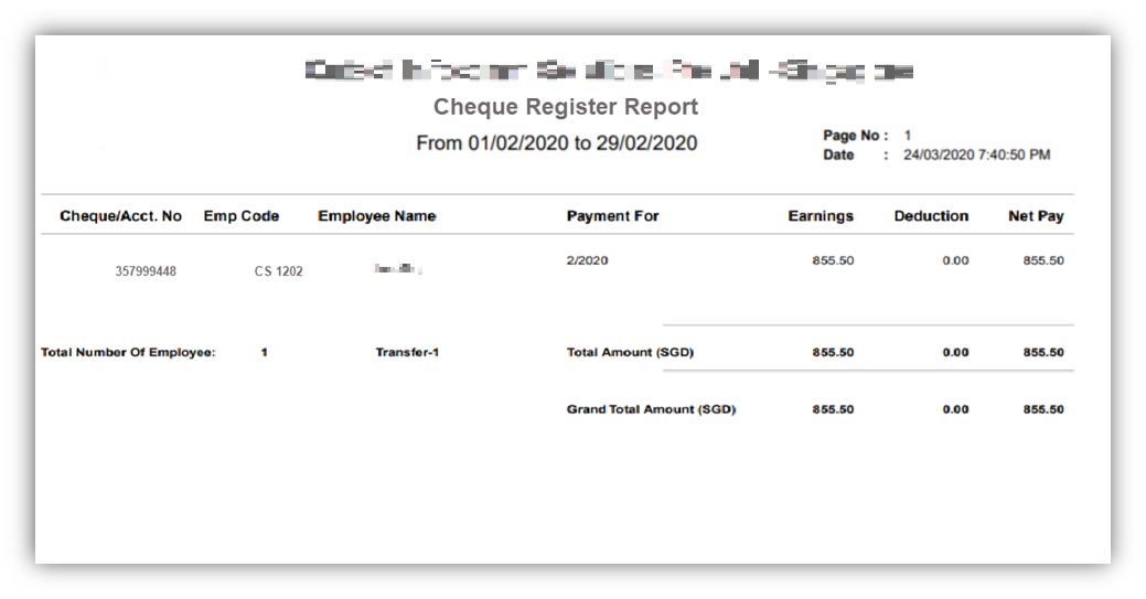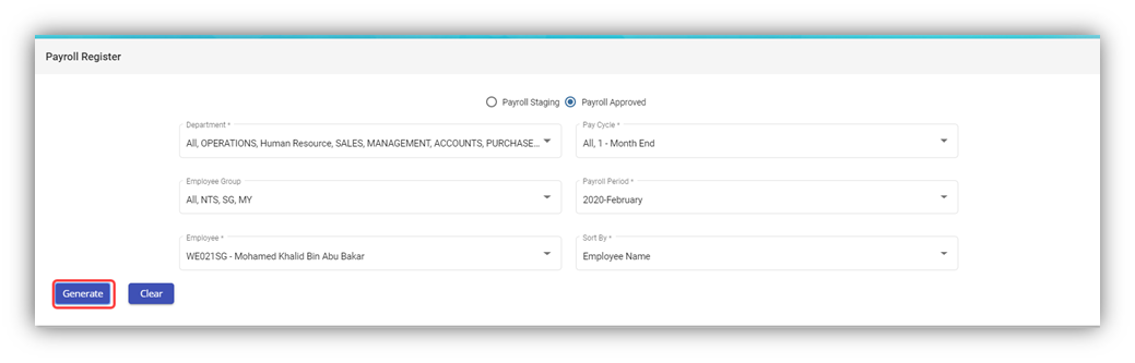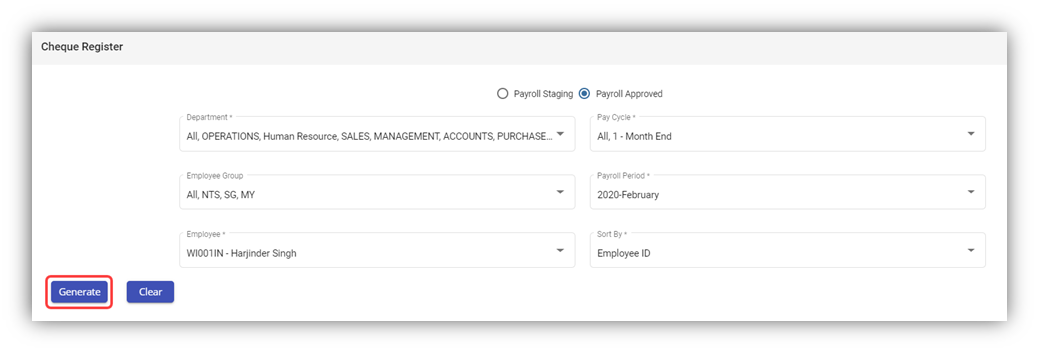 Note: You can generate the cheque register report for any employee in both the Payroll in Staging and Payroll Approved stages.