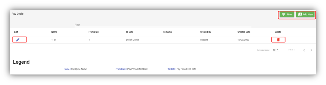 You can edit the details of the added pay cycle by using edit option provided in the Edit column of the Pay Cycle page. To edit the added pay cycle details,