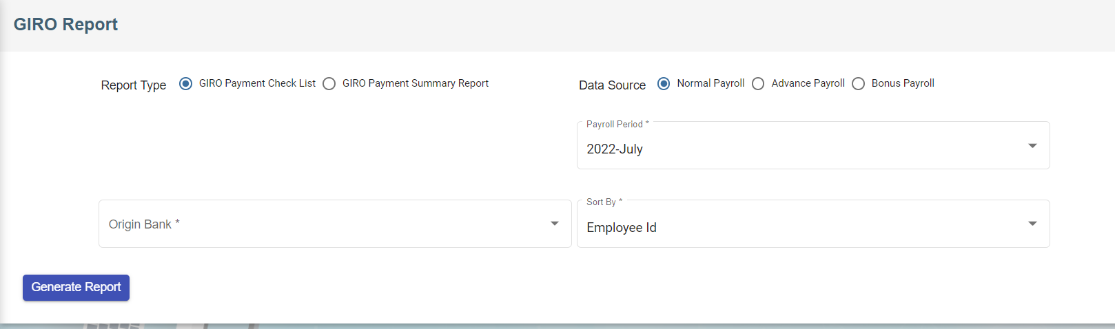 - Click GIRO Report in the Reports, the GIRO report page opens,