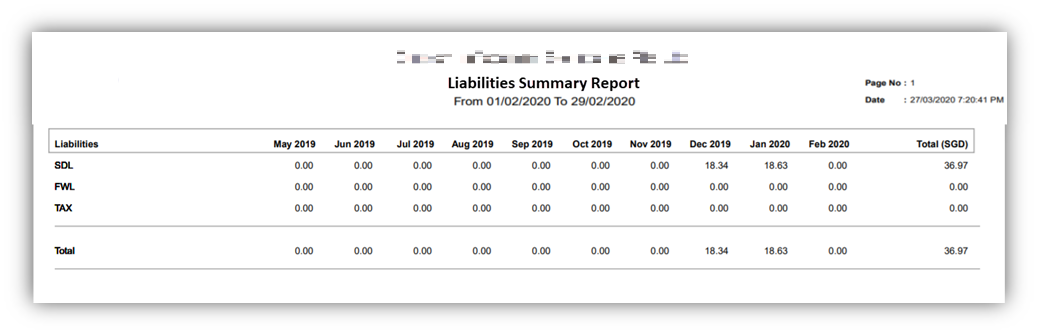The Liabilities tab in the Reports submenu used to generate and view the liabilities report of the employee. The liabilities report shows the details Skill Development Levy (SDL) paid by the company for the particular employee. To generate and view the liabilities report,