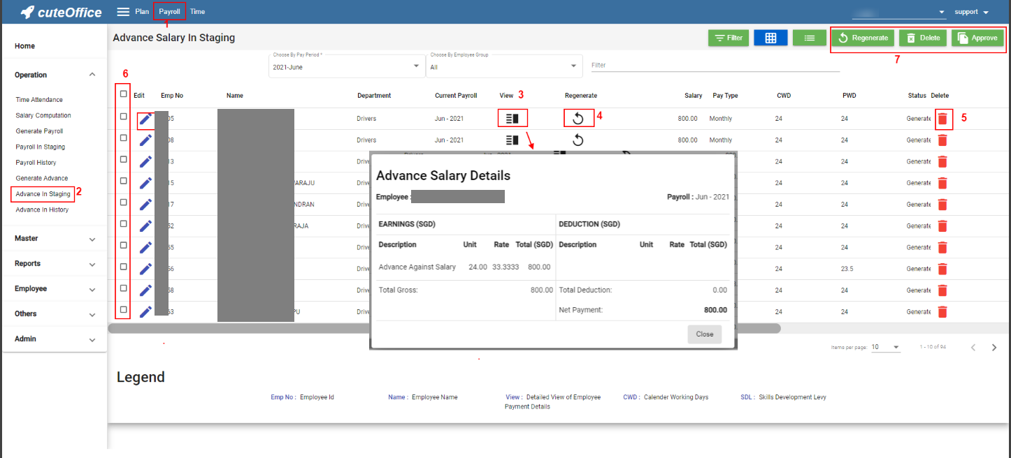 The Payroll module in the cuteOffice app involves everything having to do with the process of paying employees and filing employment taxes. It supports all necessary payroll features such as pay slips, Tax filing, CPF submissions, Giro bank files, and payroll reports such as payroll journals, summary reports, etc..