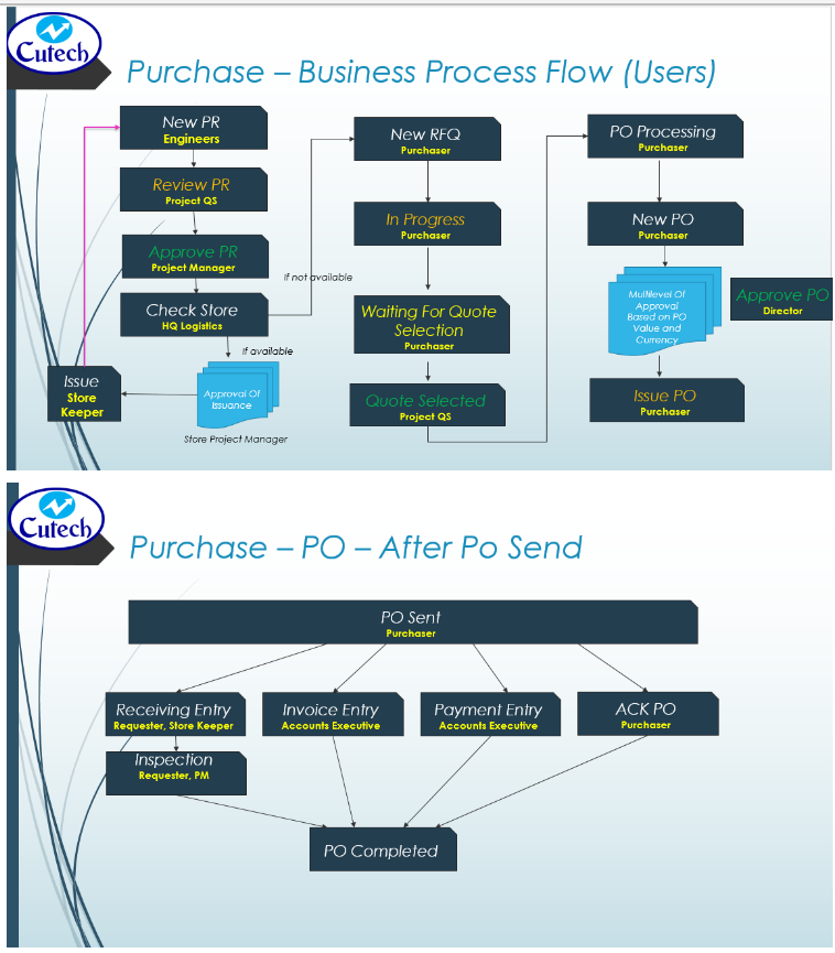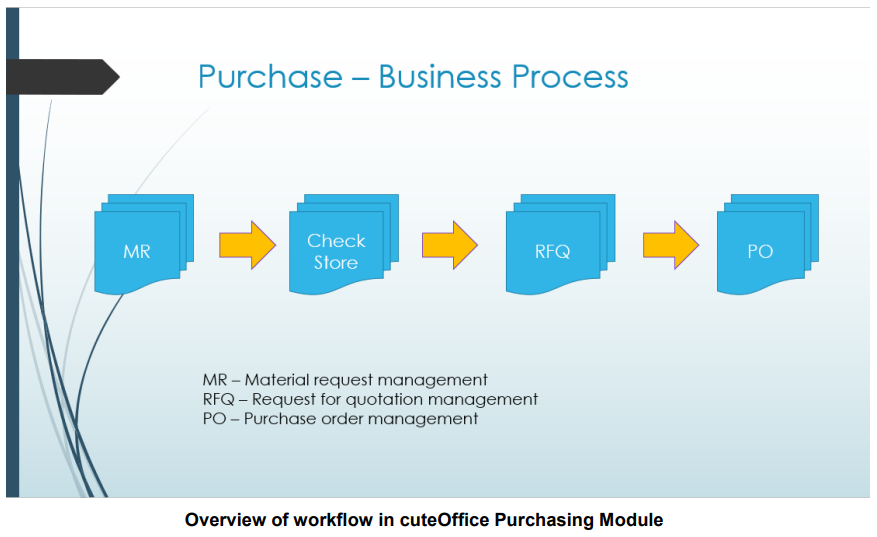 CuteOffice purchase module is designed to streamline the business process of purchasing starting from material request. When a material request(MR) is raised, cuteOffice system will check available stock of requested material: if there are available stock, system will recommend to issuance from store; if there is no available stock, system will recommend to purchase or petty cash option. The material request will be reviewed/approved, and requests for quotation (RFQs) can be created and sent to suppliers from system. System will record and compare quotations from multiple suppliers and highlight lowest cost combination for user's reference. Purchase manager need to review and approve RFQ. Then relevant purchase order(s) (POs) will be generated from system automatically, and user can email PO to suppliers from system or download PO to send to suppliers separately. User can record item receive entries and inspections against each PO.