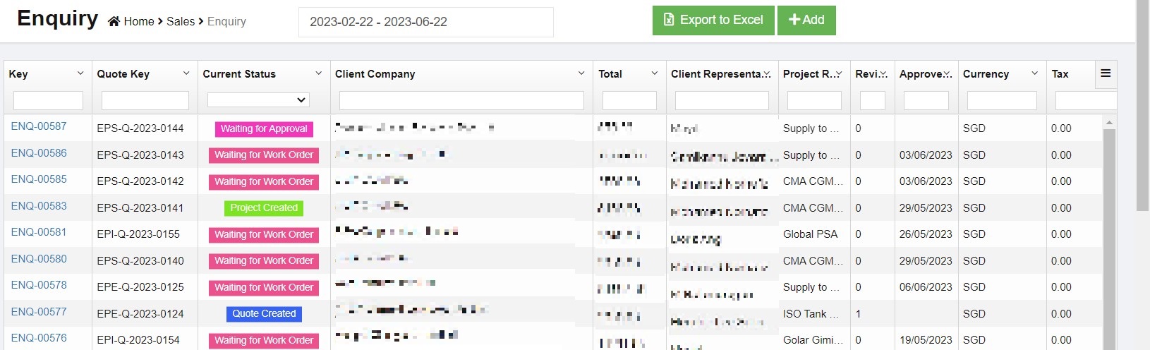 - Project Created-once client replied and approves quotation, user can enter project and the status of enquiry will change to "Project Created"