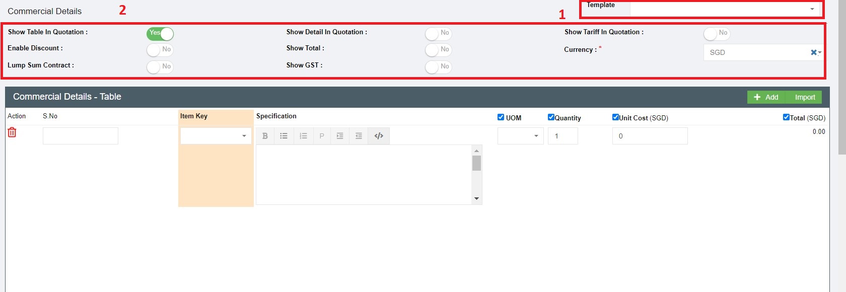 - Or customize commercial details table using the flag options in area 2 in above screenshot.