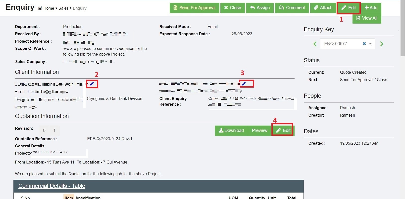 - Click the edit icon in respective area to edit details. (Note: once quotation is sent for approval, the general enquiry information and quotation information is not allow to edit and edit option will be removed.),