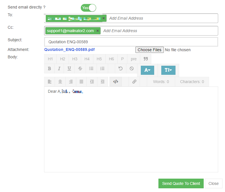 - Send email directly from cuteOffice system: click to enable "Send email directly?" to Yes, and below emailing window opens. User shall fill up all required information and click Send Quote to Client at the end.