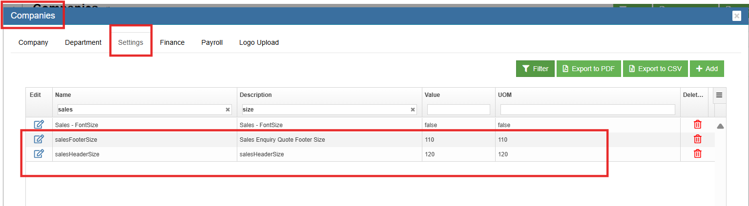 - Click add to enter header size "salesHeaderSize" for adjusting the header size