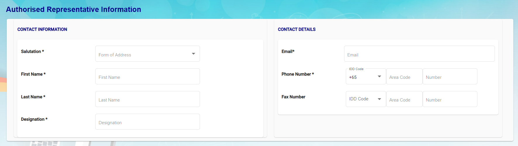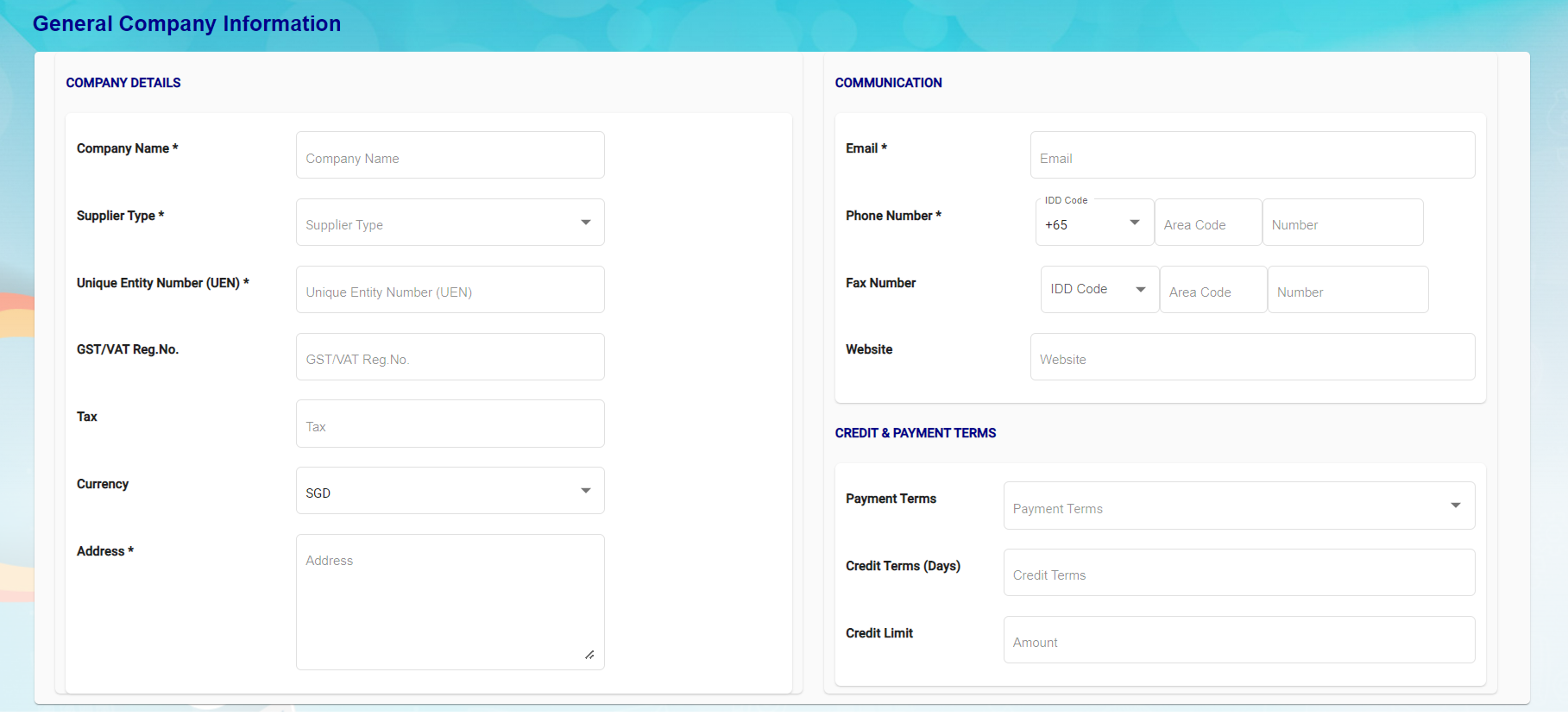 - The new supplier registration page opens as below, which includes three parts of information: General Company Information, Authorised Representative Information, Attachment: