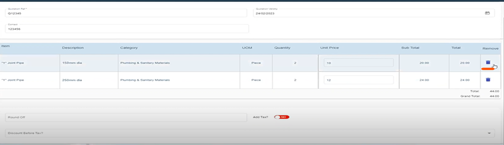 - Enter quotation reference number, validity date, contact number and enter unit price, add TAX and Discount (optional) if required. (Item can be delete from quotation from procurement module , if it is not applicable).