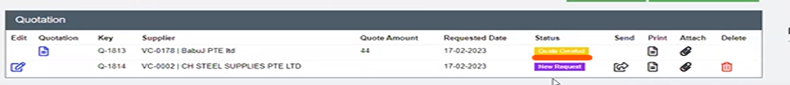 - And in procurement module RFQ list, the status of relevant quotation table in the RFQ will automatically updated as quotation created (As Procurement module and supplier module are interlinked).