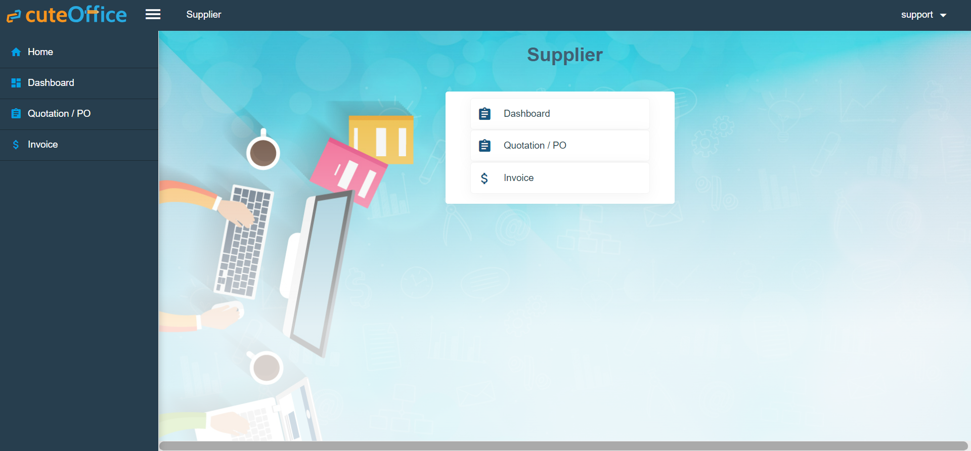 Suppliers' representative user shall register as user in cuteOffice system. Contact your Client for URL to register as supplier. New supplier shall follow below steps to create user account and navigate supplier portal in cuteOffice: