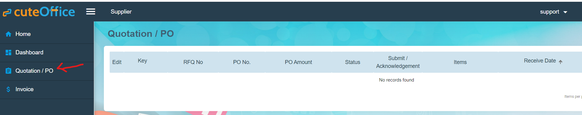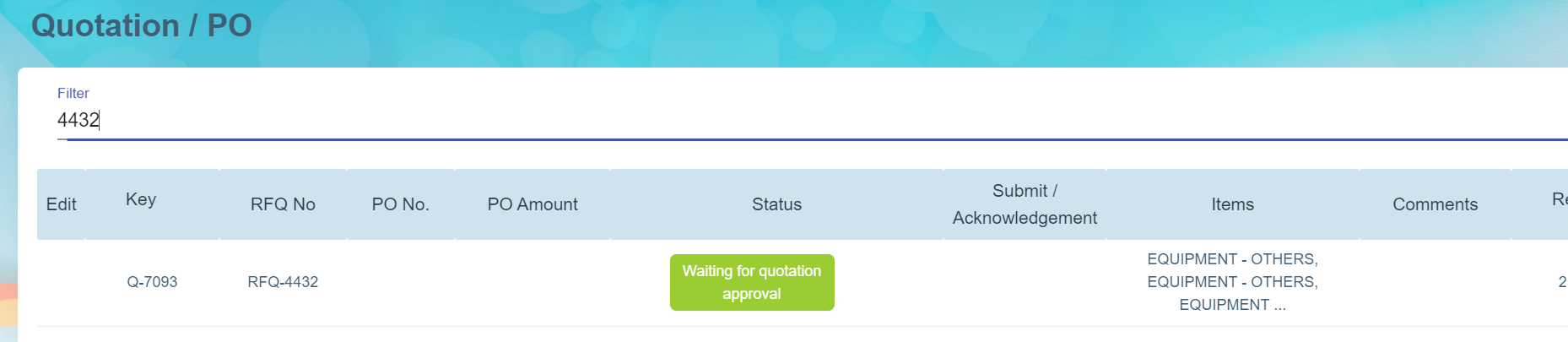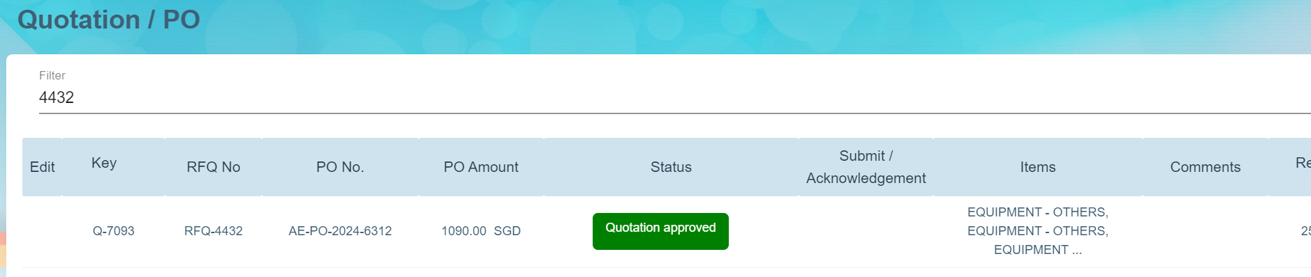- Click Quotation/PO menu in Supplier portal. The status of PO will be "Quotation approved" in Supplier portal with the PO number.