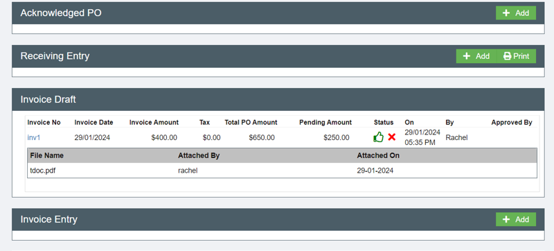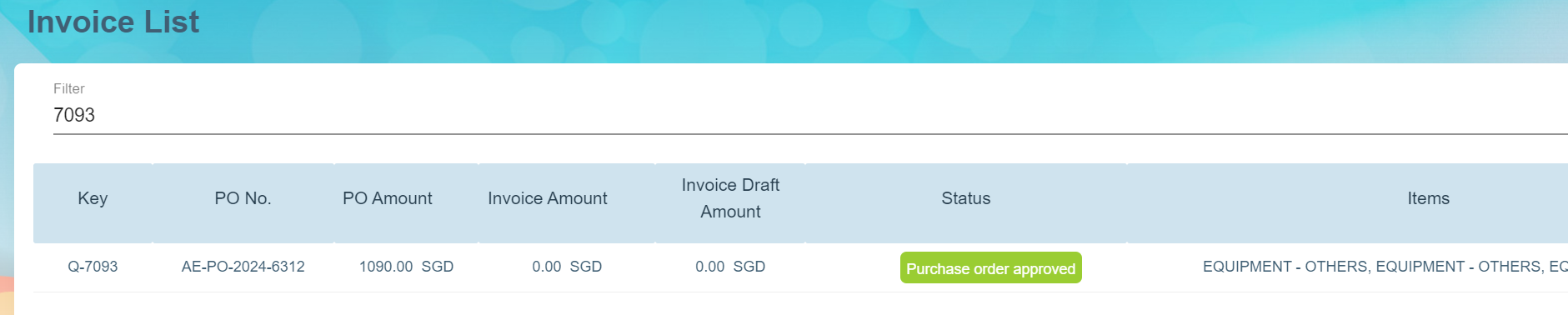 - The invoice data entered by suppliers in supplier portal where invoice status = Submitted, will be automatically synchronized to the invoice draft in client's procurement portal as shown in the below example.