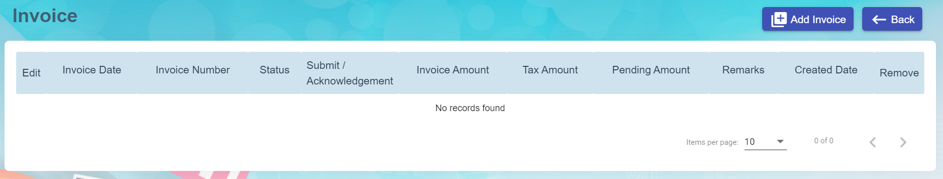 - Click on the quotation key i.e. Q-7093 in the Invoice List page and click Add Invoice button at the Invoice Page to add invoice.