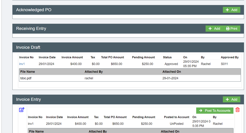 Based on the client company configuration, if there is a link between the Procurement module and the Finance module, the client user can click on Post to Accounts button at the Invoice Entry to integrate this invoice to the Finance module for payment. - Final stage is payment entry. Payment amount and pending invoice amount are entered against either invoice reference number or purchase order key as shown in the below example.