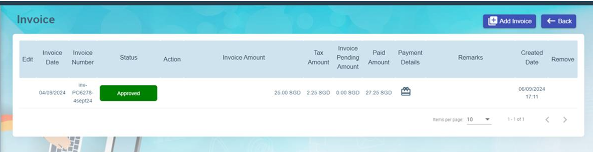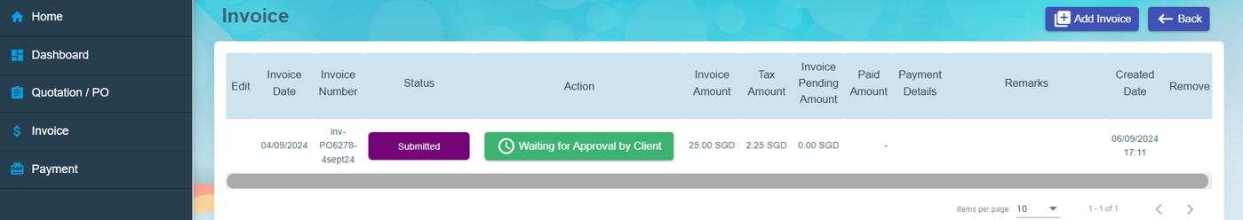 "Wating for Approval by Client" in the Action column (refer below screenshot) and this will reflect in the client’s procurement module that the invoice is final and can review to proceed to approve for payment if everything is in order.