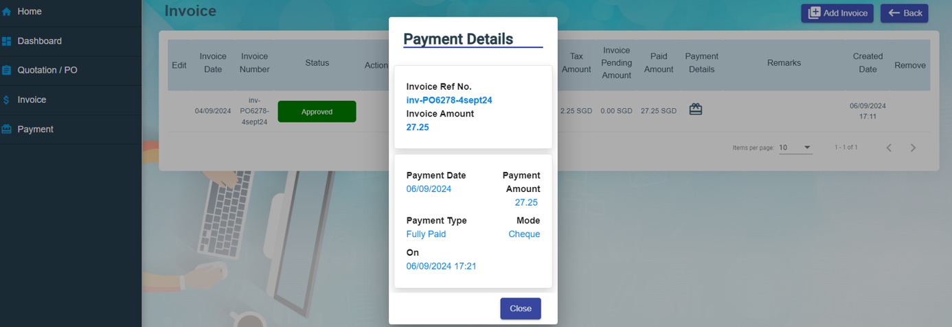 - Once invoice is approved by client and payment is generated for the invoice in the client finance module, the invoice in the supplier portal will be shown as Approved status and there will be an icon in the Payment Details column and system will show the payment details in Payment Details pop up window.