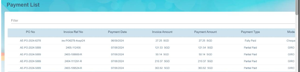 To view all payments in the supplier portal, click on the left hand side menu "Payment" and system will display all payments as shown in the below screenshot.