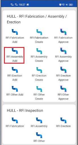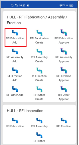 - Click RFI Fabrication Add menu .This menu helps to add the hull parts for the RFI fabrication request.