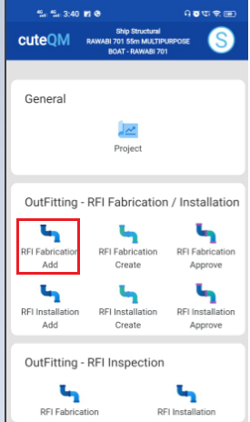 - Click RFI Fabrication Add menu .This menu helps to add the outfitting work for the RFI fabrication request.