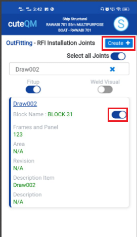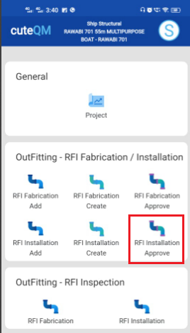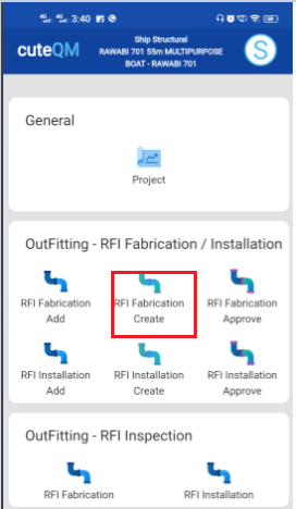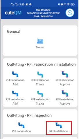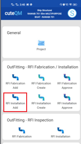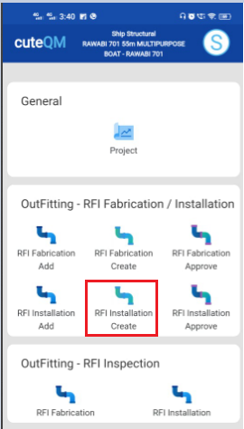 - Click RFI Installation create menu.This menu helps to create RFI requests from added outfitting parts.