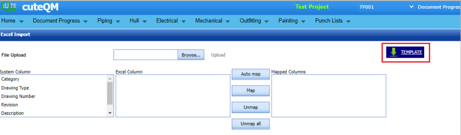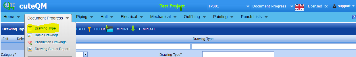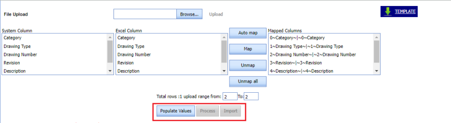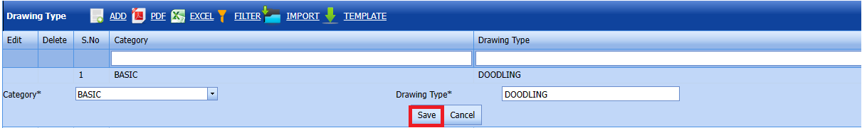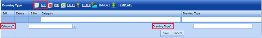 (TEMPLATE button). - An excel worksheet will be downloaded with a predefined template to enter the details of Drawing types.