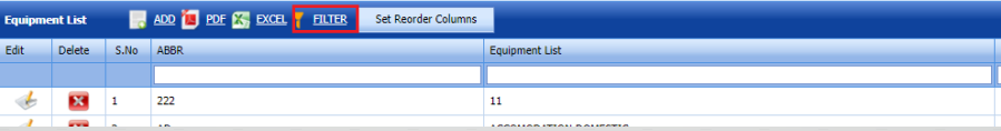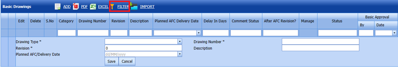 Once you clicked the Filter button, the filter box opens for the Drawing Type, Drawing Number,Description and Revision columns.