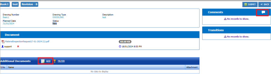 - User can add comments and additional documents in this details screen. Refer below fig.