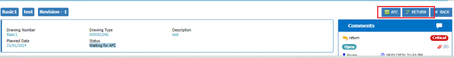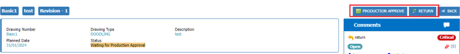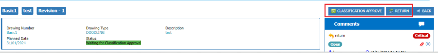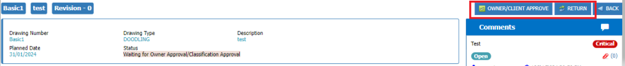 manage button to view the drawing details - Now user can see Owner/client approve and Return buttons at the top. Refer below fig