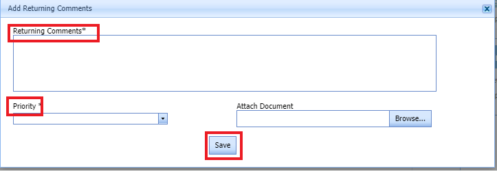 clicked it will redirected to popup window to enter return comments, priority and attachments.Refer below fig.