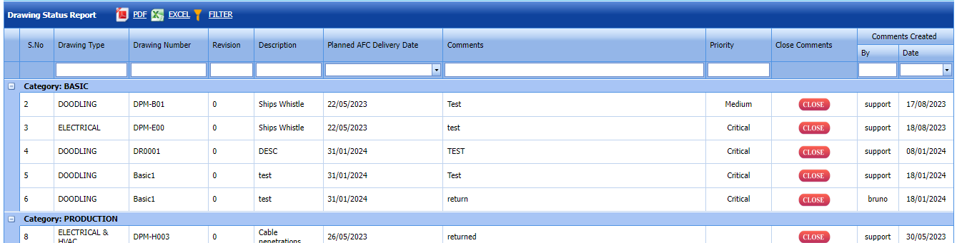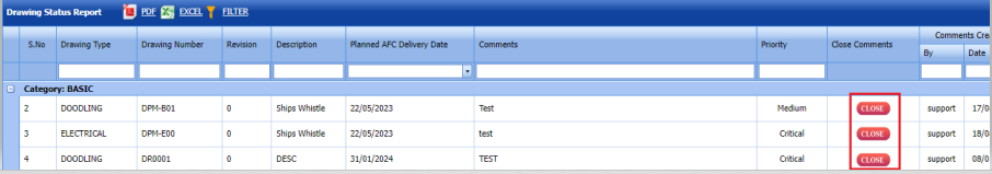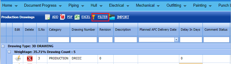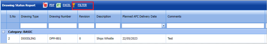 2. Enter relevant detail in the respective column’s filter box to filter any Category or Drawing type.