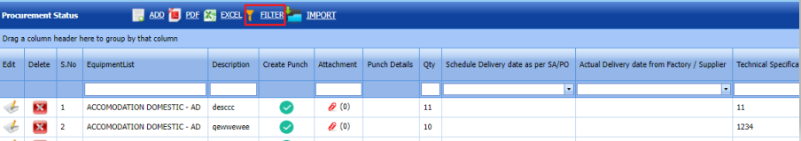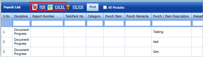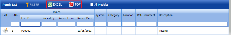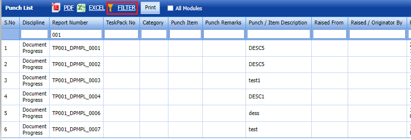 2. Enter relevant detail in the respective column’s filter box to filter any punch lists.