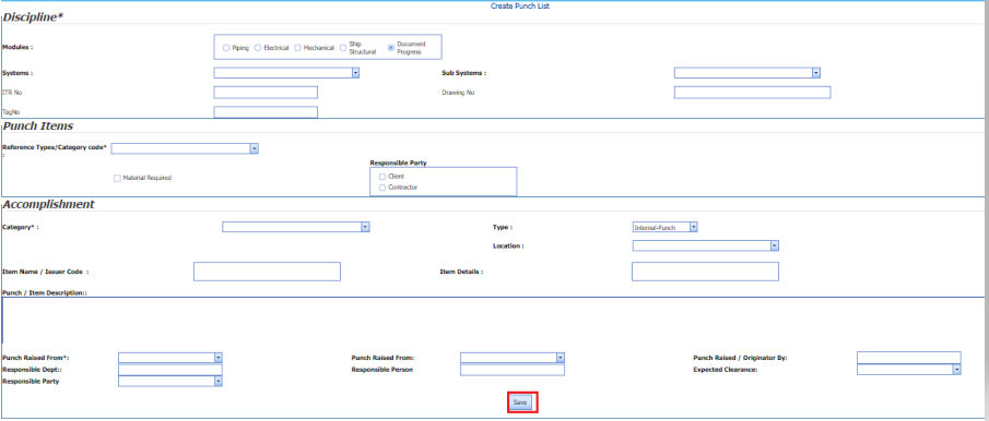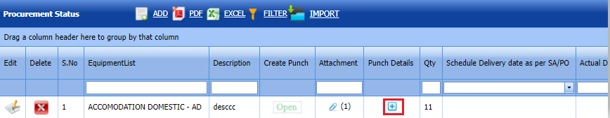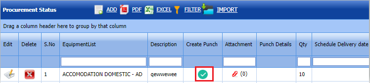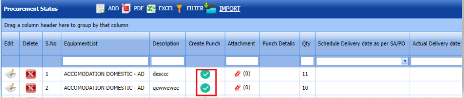 - Punchlist can be created by clicking create punch button in Procurement status list screen. Refer below fig.