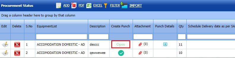 - Create punch list button again enabled in Procurement list screen once punch closed in view punch list screen .