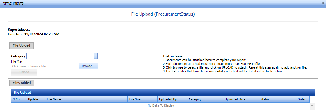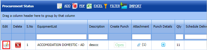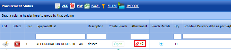 - Click Attachment button in the Procurement status list screen. Refer below fig.