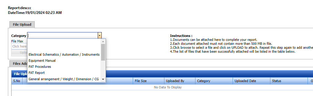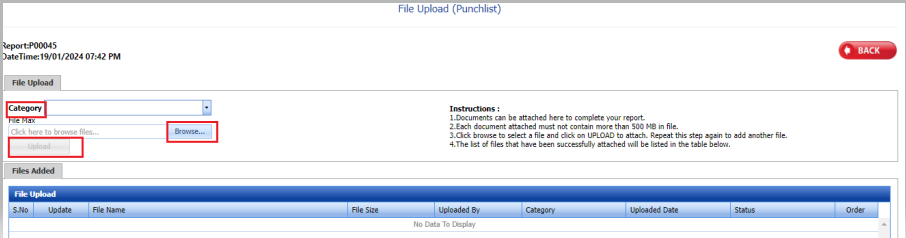 Note: Before uploading any file, read the instructions given in the File Upload (Punchlist) page. - Click category dropdown and enter category