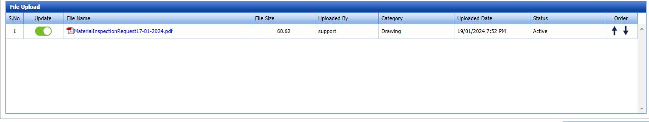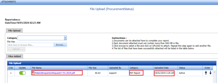 - Once document uploaded date & document name will be updated for corresponding category in the Procurement status list screen