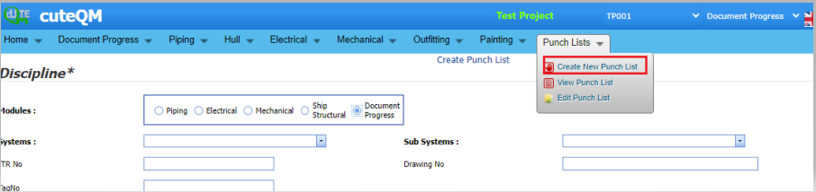 A punch list is a list of items or tasks that need to be done before a Document progress project is completed. The Punch Lists menu in the home page of the cuteQM app helps to create and view the punch lists in Document progress project.